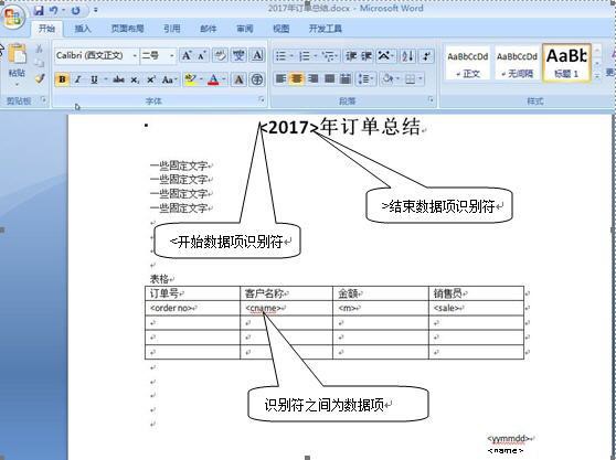 1)数据项识别符:数据项识别符之间的字符将识别成数据项,可使用任意字符(若word表格中数据需要识别为主表字段则必需以“m_”开头。如:订单号:<order_no>为按行明细表字段;<m_order_no>则为主表字段)。