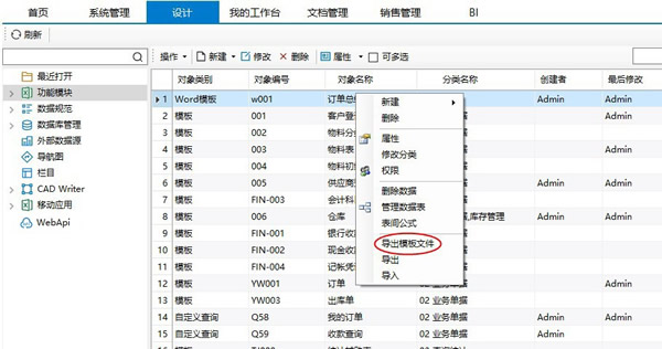 1.设计栏目选中之前的word模板:“订单总结”,右键点击【导出模板文件】。