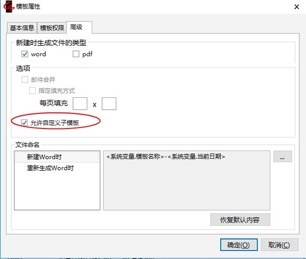 对新建产生的word文件,和用现有数据重新生成的word文件,在word模板的属性中【高级】选项卡中可分别命名文件名。