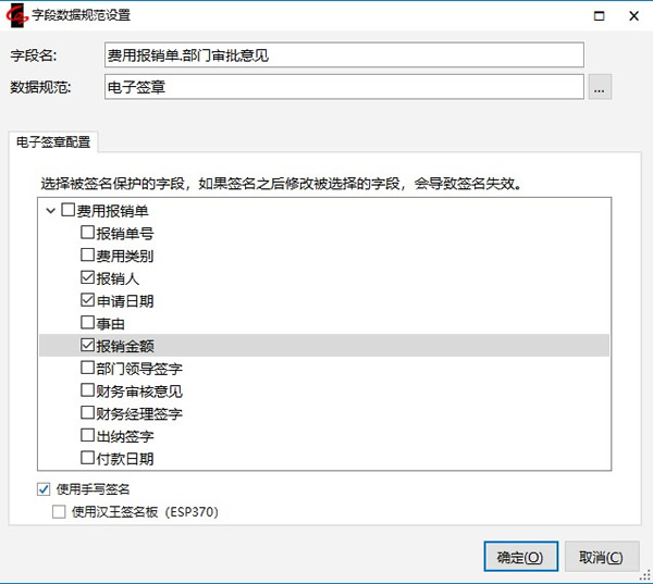 3)点击【确定】。在弹出的窗口中选择被签名保护的字段以及是否使用手写签名。