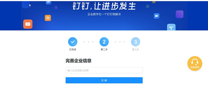 用浏览器访问 https://www.dingtalk.com/,点击【注册钉钉】。